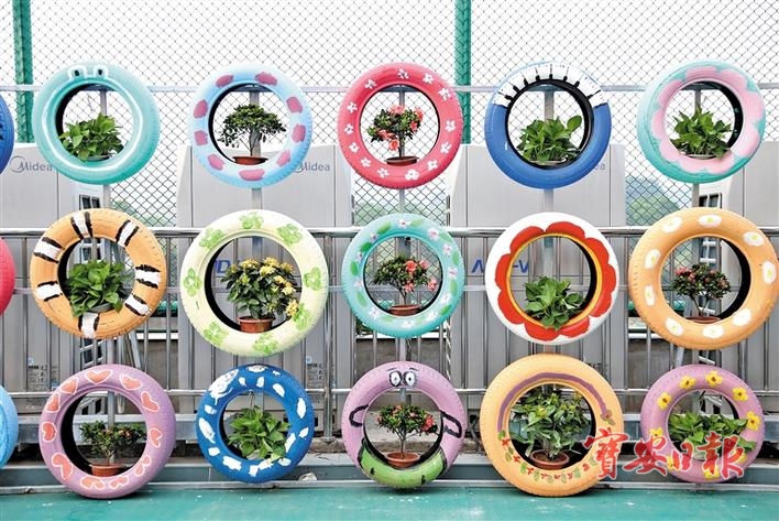 宝安星光学校近日匠心独具开展植树节融合教育主题活动,一盆盆花住进涂了色的废旧轮胎里,校园平添一景。