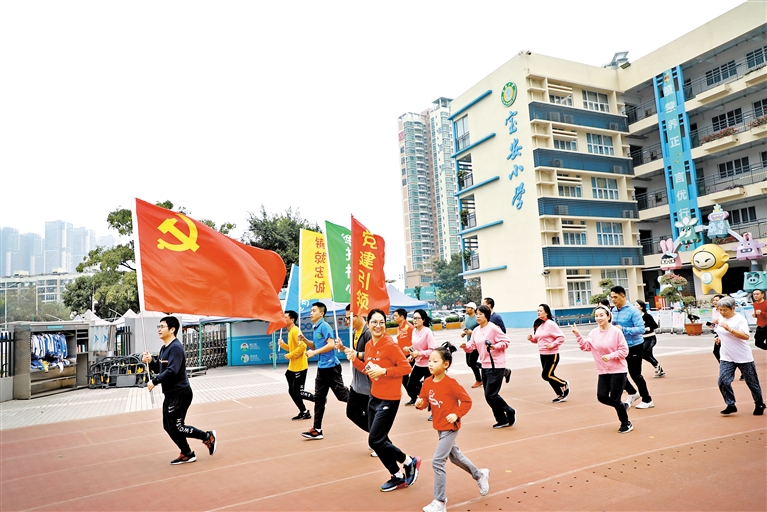 畅跑团最初成立于去年11月11日,由56名党员教师组成。在党员畅跑团带领下,非党员教师乃至部分学生、教师家属也纷纷加入,大年初一齐聚校园畅跑的人数多达108人。新学期开学以来,畅跑团坚持每周四下午学生放学后的时间,在学校操场跑步,每次至少2里,同时利用每周日的上午,在毗邻的宝安体育馆跑步,每次至少4-6里。