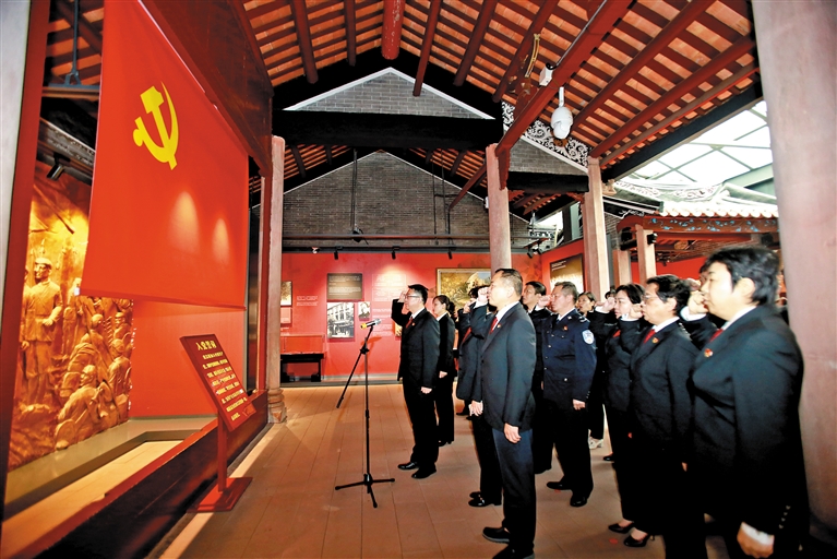 在宣誓墙前,宝安法院党员领导干部重温了入党誓词。