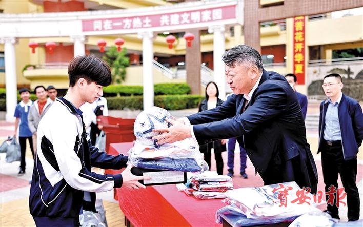 在学校内广场,阮开江和毕业于松岗中学的爱心企业家一道,向该校新疆班足球队全体成员,赠送了球鞋、球衣和足球并表示,“在春节慰问的时候,我曾承诺向学校足球队赠送球鞋和球衣,并为学校足球队聘请教练。”阮开江表示,“今天,我就是来完成这个心愿、履行这个诺言的。松岗是足球之乡,东方社区的足球队曾在全国足球乙级联赛拿到名次,这次为学校聘请的教练,就曾执教过东方社区足球队。希望同学们不断进步,快乐成长,把足球踢好!”