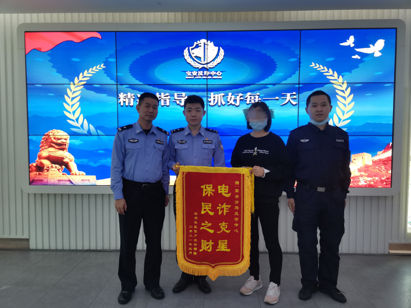 “太感谢你们了,如果不是你们及时的预警电话,我想我卡上的二十多万存款可能就没有了。”3月23日上午,沈女士专程赶到宝安公安分局反诈中心,为民警送上一面印有“电诈克星 保民之财”的锦旗,连连表示感谢。