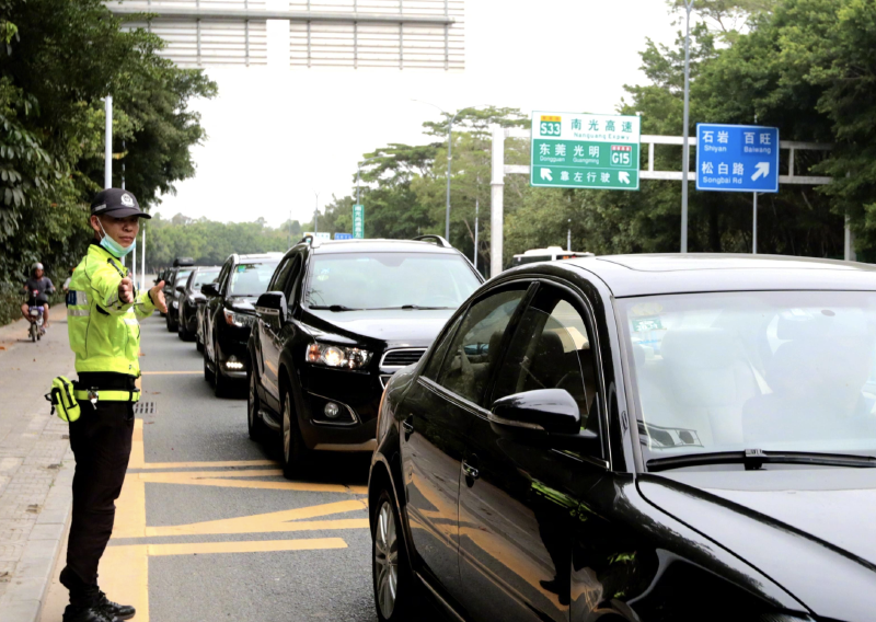 记者看到,车辆在通过大望桥后就是梧桐山和仙湖两个景区的分叉口,这也是交警设置的第一个分流点,为了确保车辆能够正常通行,全天安排警力在现场值守,进行交通疏导,高峰不散警力不退。“这个路口比较特殊,流量不固定,所以信号灯暂时没有启用,我们是人工指挥控制,根据现场的交通流量,看哪个方向车多,或者遇到有一些特殊的情况,我们就可以加快放行。”东湖交警中队副中队长李子光介绍。