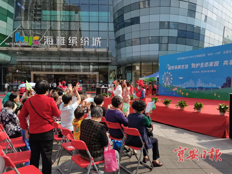3月27日下午,新安街道在海雅缤纷城建安路广场举行“2021年生态文明建设暨‘地球一小时’宣传活动”,以 “地球一小时”主题日为契机,开展“线上+线下”生态文明建设宣传活动,向市民宣传低碳理念、碳达峰和碳中和理念、生态行为规范、生态文明知识等,共同建设美丽新安。