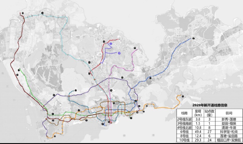 2020年我市共开通6条合计108公里地铁线路,轨道交通线网(包含有轨电车)运营里程跨越400公里大关,达到422.4公里,运营站点增至254座。2020年是继2016年地铁7、9、11号线开通之后,开通线路里程最多的一年。新线的开通,结束了光明、盐田、福保、观澜等多个片区“无地铁”的历史,进一步提升全市轨道交通线网的服务范围及乘客出行的便捷性,有效缓解了关键断面高峰时段的通勤客流压力。
