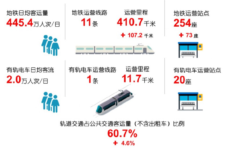 2020年我市轨道交通线网(含有轨电车)共运输乘客16.3亿人次,日均客流445.4万人次。值得一提的是,地铁全年日均客运强度达1.31万人次/公里,该指标虽受新冠肺炎疫情以及新线处于客流培育期等因素影响,较去年有所降低,仍排名全国第一。12月31日,轨道交通线网客运量再创新高,达773.4万人次,同比2019年增长9%。