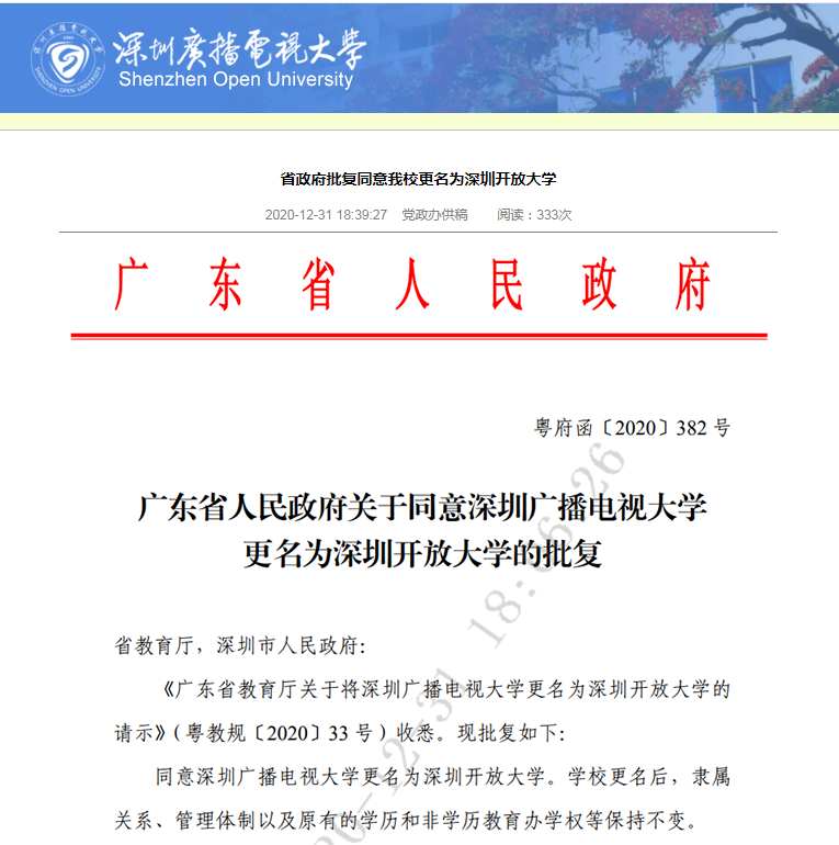 2020年12月31日,广东省人民政府批复广东省教育厅、深圳市人民政府,同意深圳广播电视大学更名为深圳开放大学。