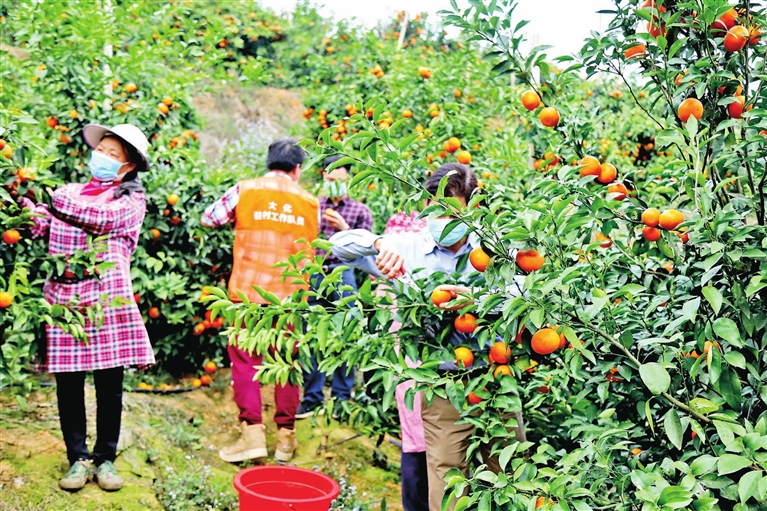 鑫荣懋集团帮扶的大化柑桔园内,果农正忙着收获。