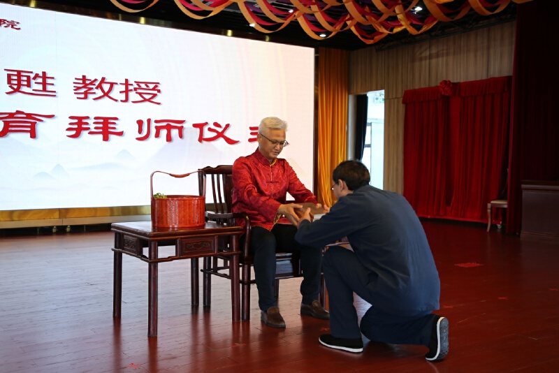 在悠扬的古琴乐声中,雒晓东教授、郑甦教授身着传统服装,弟子刘勇、孙克民分别向师父行跪拜礼、敬奉香茗、递“拜师贴”、奉赠“束脩六礼”;师父授“师训”、赠中医《四大经典》。仪式古朴庄重,彰显了中华传统文化历久弥新和无穷魅力,展现了数千年来中医药传承的重要地位。