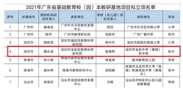 根据《广东省教育厅关于组织申报广东省基础教育教研基地项目的通知》要求,经项目负责人自主申报、地市教育局推荐、省厅组织专家评审等程序,宝安区教科院教研二部与宝安中学(集团)初中部联合申报,获得2021年广东省基础教育校(园)本教研基地项目立项(全省30个,深圳市仅2个)。