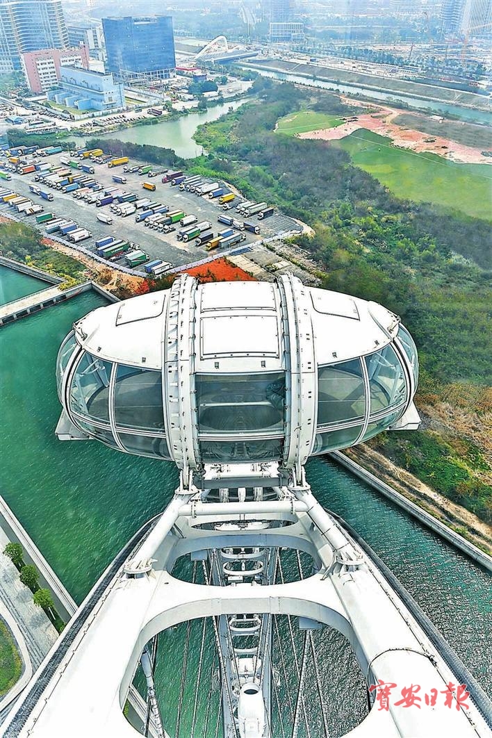 从摩天轮128米的高空看宝安,确实有新的视角、别样的风景。当轿厢缓缓转动上升,双界河、宝安湾、沿江高速、大铲湾港区、欢乐港湾园区以及前海风光依次映入眼帘。阳光有多少穿透力,目之所及就有多远。“高空看宝安,天是那么蓝、海是那么绿,你会发现这个自己一直在奋斗的城市真的很美。”本报记者黄芳如是说。