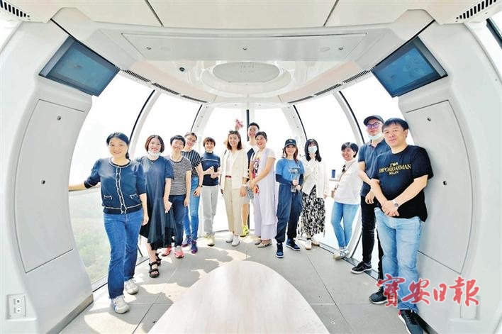 4月6日上午,《宝安日报》记者团共同来到“湾区之光”摩天轮,排队依次进入乘坐区。准备入舱前,摩天轮轿厢缓缓地在着陆台转动,抬脚进入时和乘坐扶手电梯的感觉差不多,不急不缓。本报记者张小葵恐高,在排队时一度犹豫还要不要上去,鼓起勇气乘坐后,她表示没有想象中害怕,摩天轮运行时非常平稳,只要不是一直依靠在玻璃窗前,恐高的感觉就不那么明显。当轿厢上升至最高点,张小葵还在全景玻璃窗前勇敢地拍了张照片。