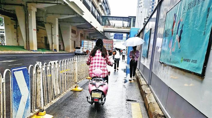 松岗街道沿河路有市民骑着加装了雨棚的电动二轮车拉客。
