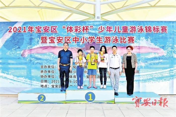 2021年宝安区“体彩杯”少年儿童游泳锦标赛暨宝安区中小学生游泳比赛于10日下午在宝安区体育中心游泳场收官。来自宝安小学、径贝小学、滨海小学、建安小学、海韵学校、宝安中学、孝德学校、新安中学(集团)第一实验学校及11家俱乐部的354名队员参赛,参赛规模再创新高。经过一天的角逐,径贝小学、宝安小学、滨海小学获学校组团体总分前三名,宝安泳协、奥德森、思特体育获俱乐部团体总分前三名。区文化广电旅游体育局、区教科院及宝安体校等单位领导出席颁奖仪式并为获奖队伍颁奖。