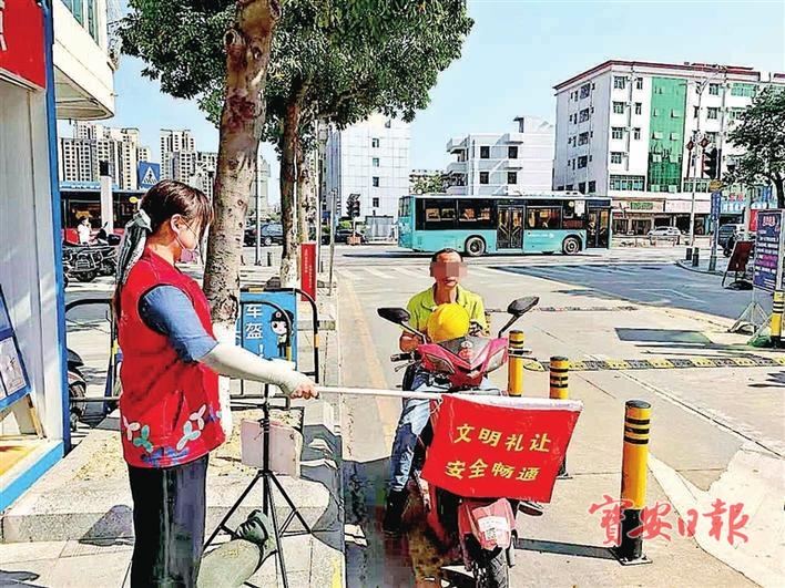 4月11日,记者在福永大道政丰北路口看到,身穿红马甲的街道义工手举红旗引导市民文明出行、不闯红灯,一位市民骑电动车搭载朋友,两人都没有佩戴头盔,义工和工作人员将他们拦下来,并对他开展现场交通安全教育,引导他观看视频、抄写交规。该男子一边抄一边念,他的朋友站在旁边一起学。