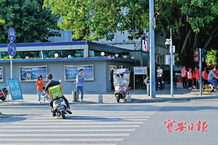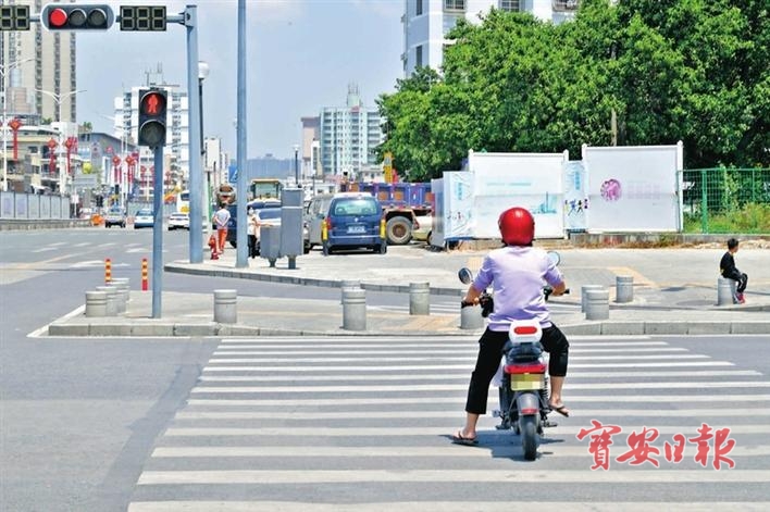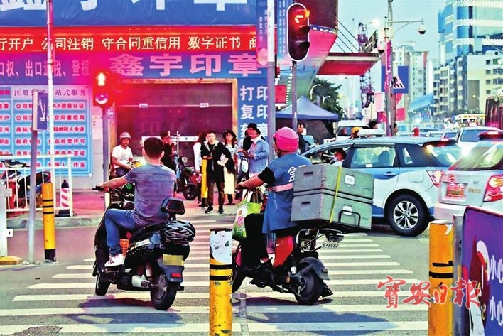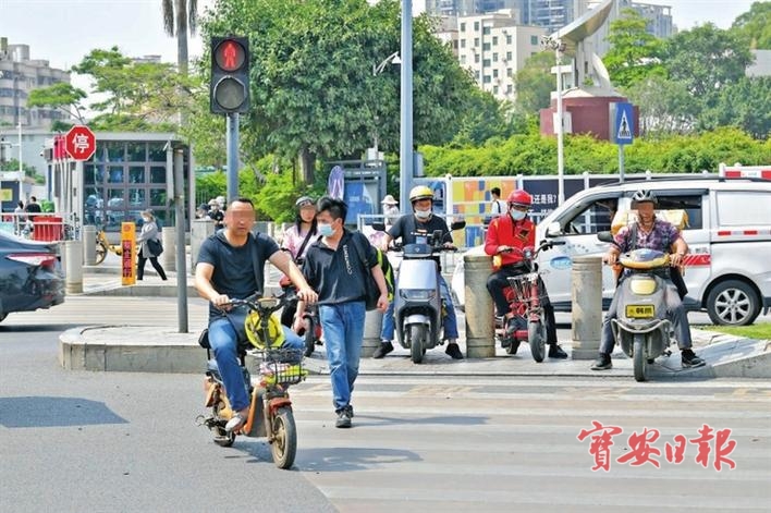 在新安街道新安四路与公园路交会处的十字路口,电动二轮车闯人行红灯。