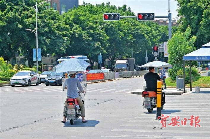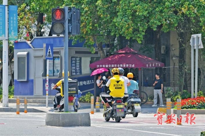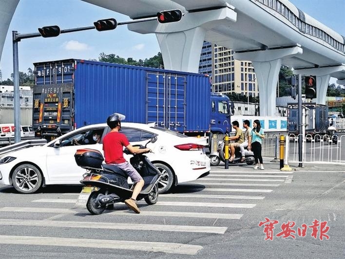 在沙井街道宝安大道(沙井段)上,电动二轮车闯人行红灯。