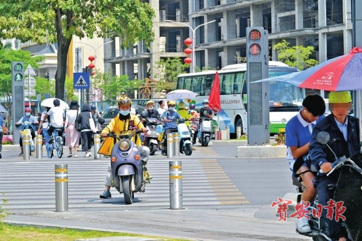 在西乡街道流塘路上,电动二轮车闯人行红灯。