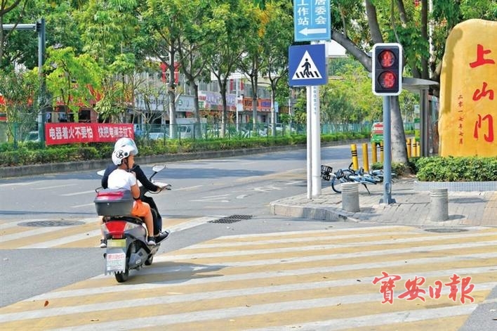 燕罗街道上山门社区门口,电动二轮车闯人行红灯。