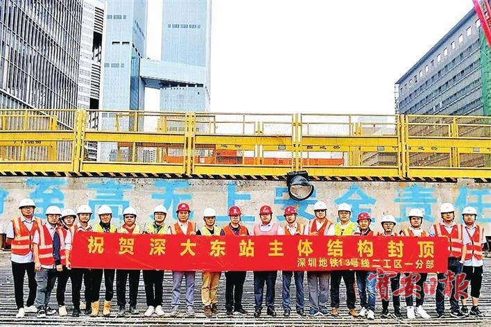 4月9日上午,随着最后一块顶板混凝土浇筑完成,中建深圳地铁13号线二工区深大东站主体工程顺利完成封顶。这是地铁13号线全线第7座车站封顶完成,至此,深大东站附属结构施工全面拉开序幕。