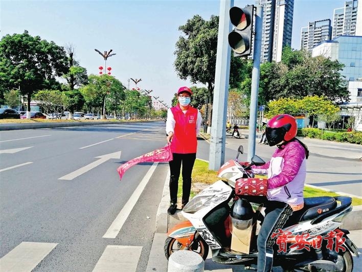 志愿者在路口指挥交通。