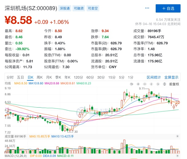 从A股二级市场行情表现看,深圳机场走势随一季度市场进一步复苏,行情进一步转好。最近两个月已走出底部区域,逐步攀升,4月16日收盘报8.58元,总市值176亿元。按2月5日低点7.36元算,至4月16日区间涨幅16.58%。