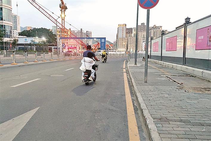 在新桥街道新沙路上,市民在机动车道上骑行电动二轮车。