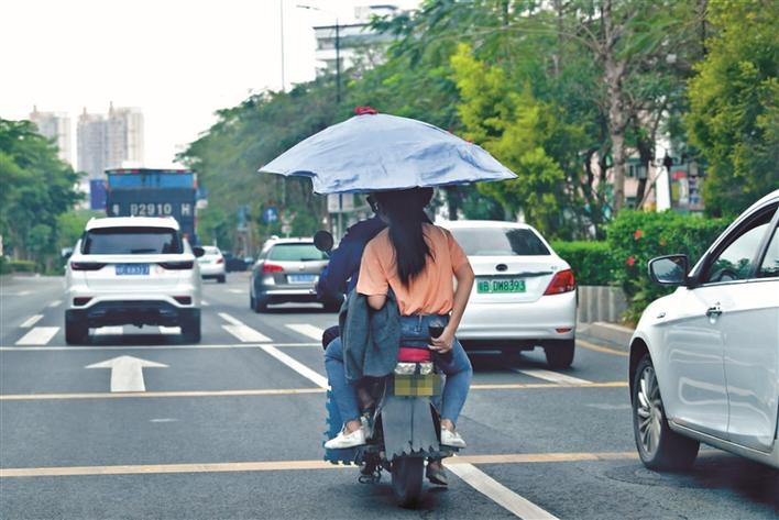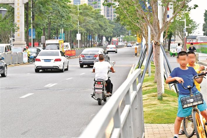 福永街道凤凰山大道上,市民载人在机动车道上骑行电动二轮车。