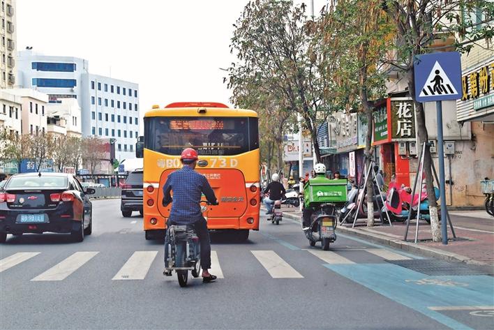 在新安街道创业一路,市民在机动车道上骑行电动二轮车。