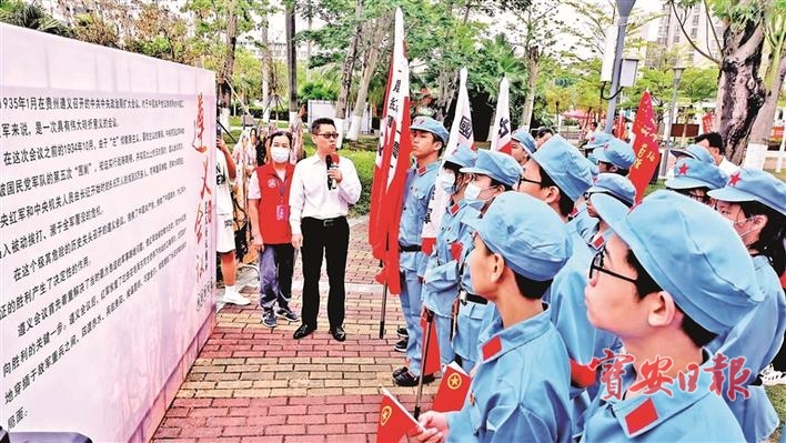 作为本次活动的一大亮点,参观学习环节利用洪浪公园的空间仿制了红军的行军路线,起点为于都,终点为吴起镇,并结合遵义会议、四渡赤水、飞夺泸定桥、过松潘雪山草地、勇夺腊子口五个节点,现场众多党员、青少年模拟重走长征路。每个节点还结合展板展示和讲解,全面呈现长征各个节点的历史背景、战役结果、历史意义等,声情并茂的讲解还吸引了众多市民驻足聆听。