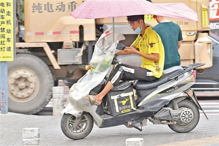 记者在十个街道蹲点,时常能看到配送人员骑行电动二轮车违章,还有人特意加装了遮阳篷,或是将储物箱放在了驾驶位前方,妨碍安全驾驶。此外,因抢单或利用导航软件等原因,配送人员在骑车时看手机的行为较普通市民频率更高。