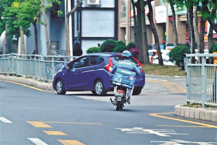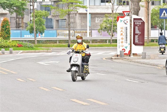 在松岗街道溪头路,外卖配送人员在机动车道上骑行电动二轮车。