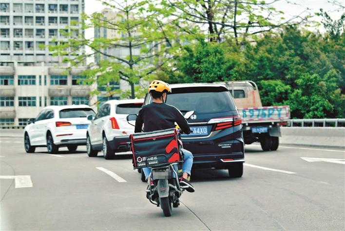 在新桥街道中心路,外卖配送人员在机动车道上骑行电动二轮车。
