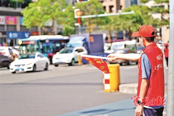 沙井街道每周末组织近30名学生志愿者在辖区繁忙交通路口开展文明劝导志愿服务。