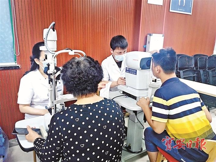 医务人员给居民做眼部检查。