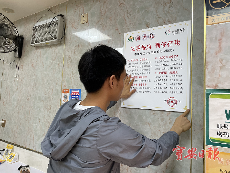 ▲在美食商铺张贴《甲岸社区文明餐桌行动指南》。