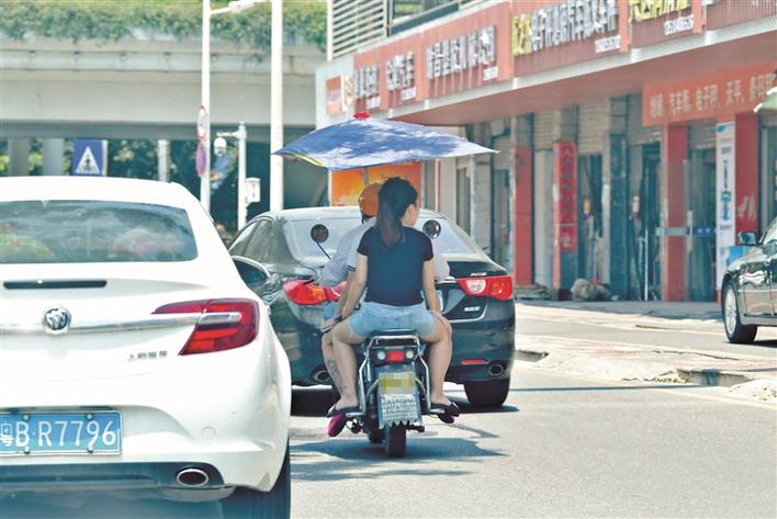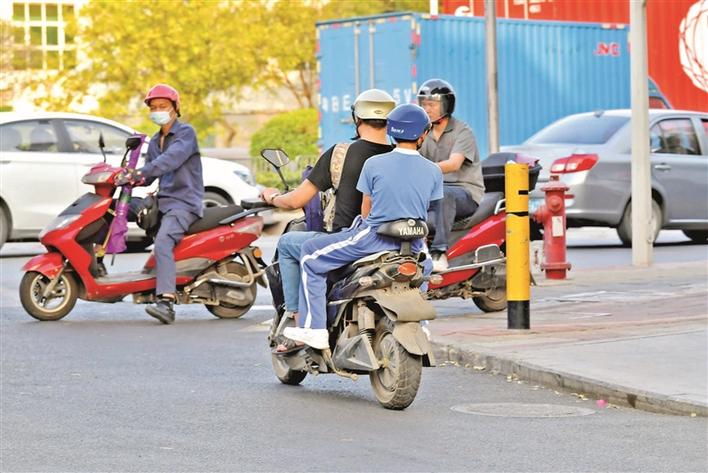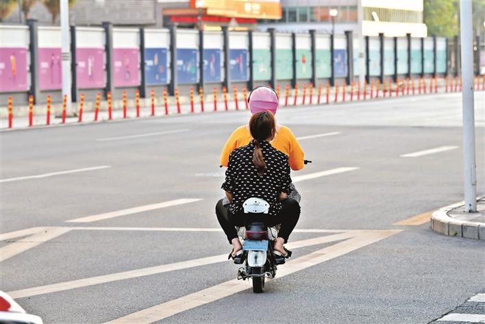 在燕罗街道松罗路,有市民载人骑乘未备案电动二轮车。