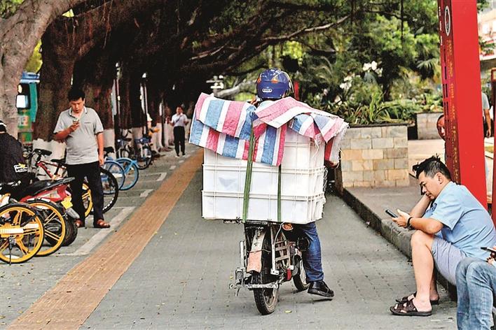 在新安街道公园路,有市民骑乘未备案电动二轮车载物。