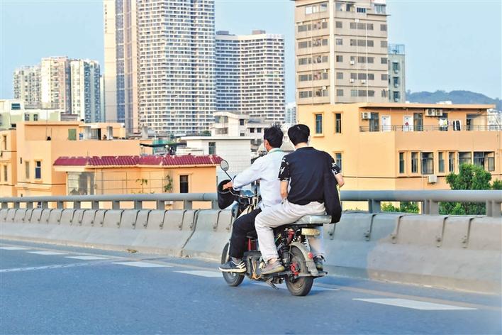 在西乡街道西乡立交上,有市民骑乘未备案电动二轮车载人。