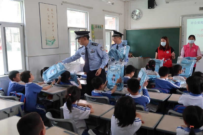 警察叔叔给学生送爱心书包。