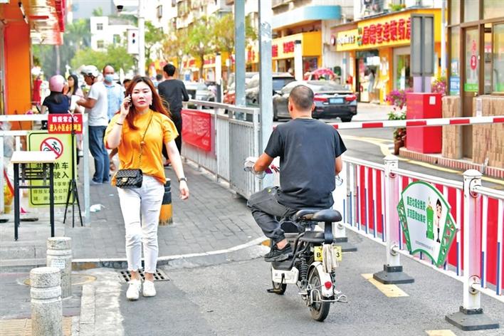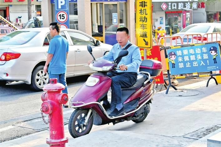 在福海街道稔田社区,有市民未佩戴头盔骑行电动二轮车出入。