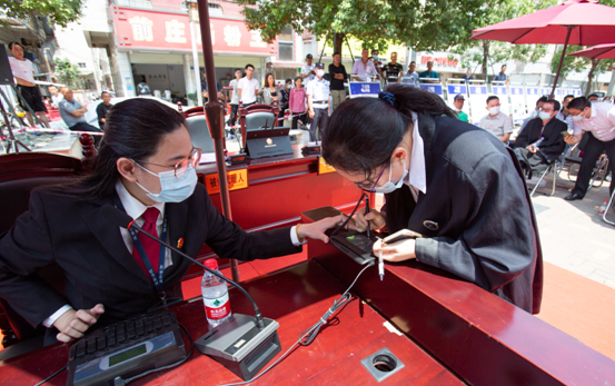 烈日下的庭审与嘈杂的来往人群掩盖不住法庭的庄严肃穆,在缜密的法庭调查、法庭辩论后法官做出了当庭宣判,此次巡回法庭采用的是无纸化模式开庭审理的,法官通过电子屏幕查阅电子卷宗,庭审笔录采用电子签名的方式,大幅提升庭审效率,是宝安法院信息化建设与司法工作深度融合有力展现。