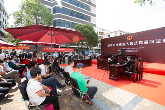 为响应最高人民法院关于审判公开的号召,发挥人民法庭基层司法单元的功能优势,积极参与辖区打造共建共治共享的社会治理格局,认真贯彻落实全国政法队伍教育整顿活动的部署, 4月22日上午,宝安法院西乡法庭开展无纸化巡回审判暨网络直播活动,将审判庭搭建至西乡街道铁岗社区的广场上,零距离审理与群众生活息息相关的一起劳动争议案件。