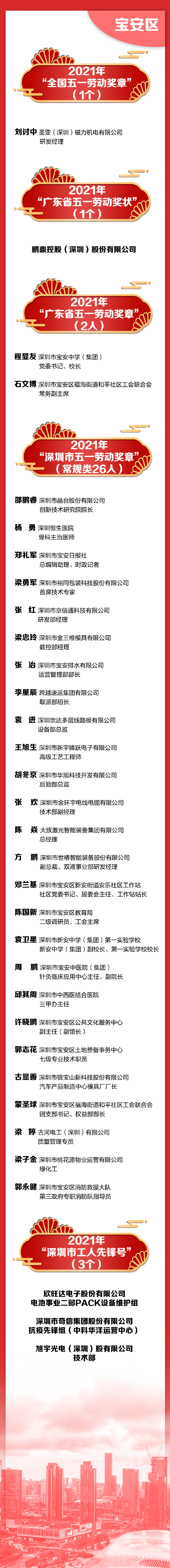 劳动最光荣,奋斗者最幸福。4月24日上午,深圳市召开庆祝2021年“五一”国际劳动节暨表彰大会,授予17个集体“深圳市五一劳动奖状”、299名个人“深圳市五一劳动奖章”、33个车间班组(科室)“深圳市工人先锋号”荣誉称号。此外,还有60名深圳市第十届职工技术创新运动会暨2020年深圳技能大赛优胜个人被授予“深圳市五一劳动奖章”,2个优胜集体被授予“深圳市工人先锋号”荣誉称号。参加表彰大会的还有2021年深圳市的全国和广东省五一劳动奖获得者,其中宝安区的刘讨中荣获2021年“全国五一劳动奖章”,鹏鼎控股(深圳)股份有限公司荣获2021年“广东省五一劳动奖状”,程显友、石文博荣获“广东省五一劳动奖章”。