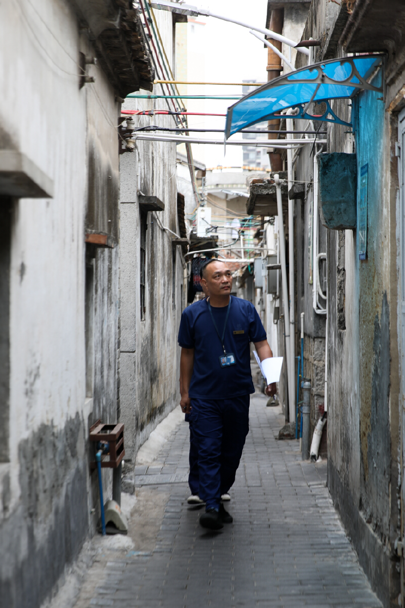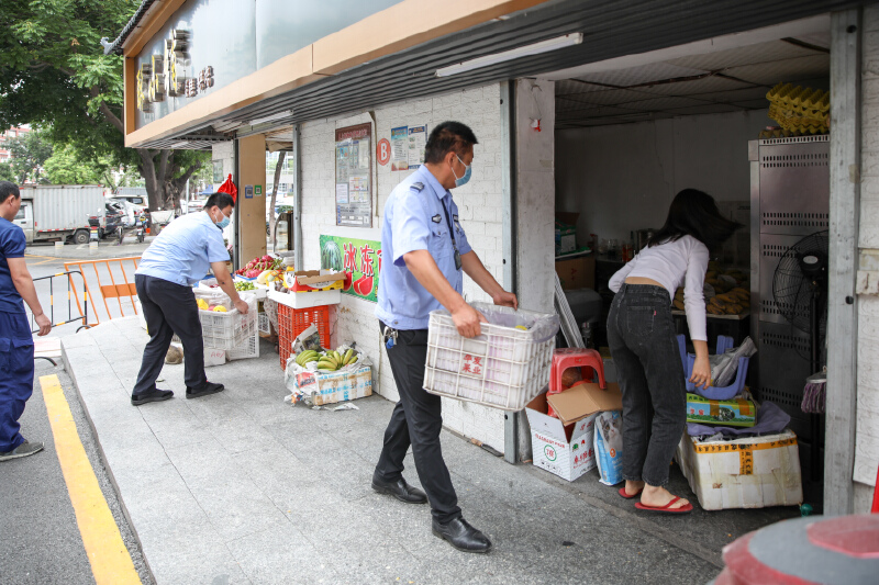 物业巡查员劝导社区店铺门面不乱摆放