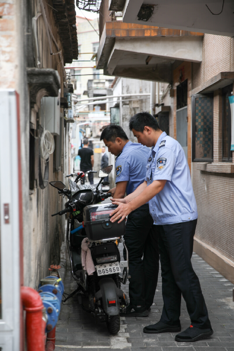物业巡查员在摆放不规范停放的电单车