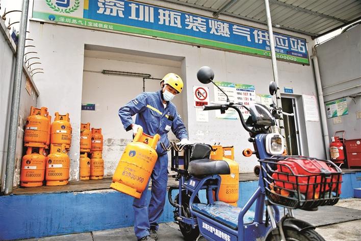 深圳瓶装燃气宝城供应站,送气工装上气瓶,准备出发。