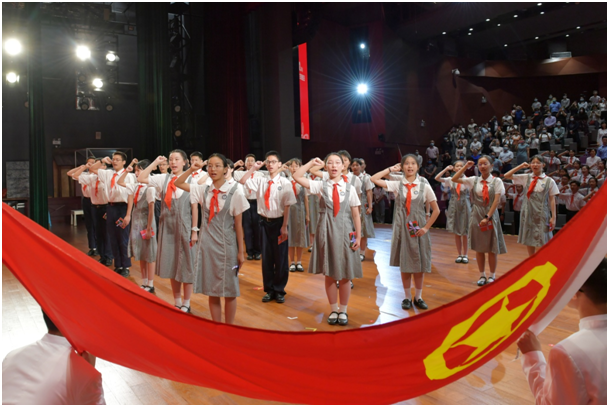 行队礼、出队旗、唱队歌……在全体参会人员的共同见证下,87名到龄离队的少先队员面向队旗整齐排列,最后一次唱响队歌,最后一次行队礼,告别系满梦想的红领巾,为自己的少先队生活画上圆满句号。紧接着,出团旗、奏团歌,87名优秀少先队员告别红领巾,面对团旗庄严宣誓,光荣加入中国共青团。我区优秀共产党员代表、疫情防控先进个人代表、脱贫攻坚先进个人代表、优秀退役军人代表、劳动模范代表、优秀青年团员代表为新团员代表颁发团章、团员证和团徽。团区委主要负责同志、区少工委主要负责同志分别寄语,鼓励同学们志存高远、脚踏实地,自觉将个人理想与实现中华民族伟大复兴结合起来,把爱国情、报国志转化为增强才干、艰苦奋斗的实际行动,成长为能够担当民族复兴大任的时代新人。