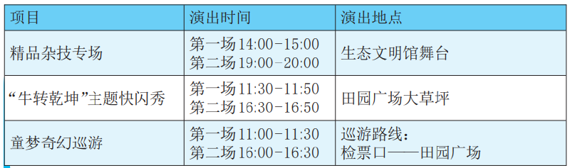 五一假期园区将举办舞台精品杂技专场、“牛转乾坤”主题快闪秀、童梦奇幻巡游等活动,具体安排如下: