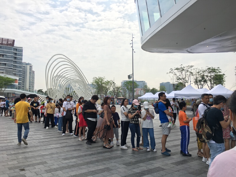 今早9点不到,宝安欢乐港湾园区内已经人流如织,市民朋友按照提前预约的流程有序入园,妈妈牵着孩子、爸爸扶着老人,大部分市民都是一家人休闲游逛,而备受欢迎的“湾区之光”网红摩天轮下早早就排起了等候乘坐的队伍。