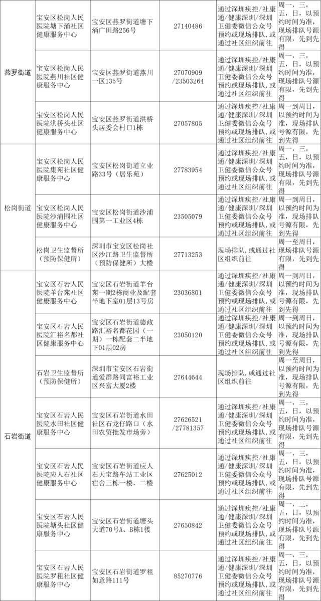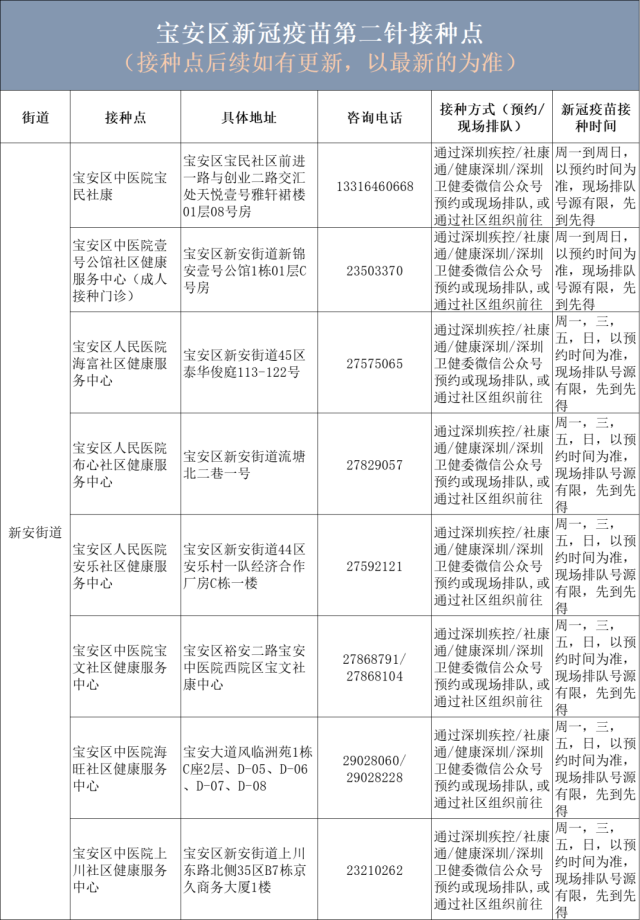目前,宝安区新冠疫苗第一针指定接种点主要满足接种首针新冠疫苗的需求,需要接种新冠疫苗第二针的请看过来(目前优先接种第一针接种间隔已满6周以上者)。